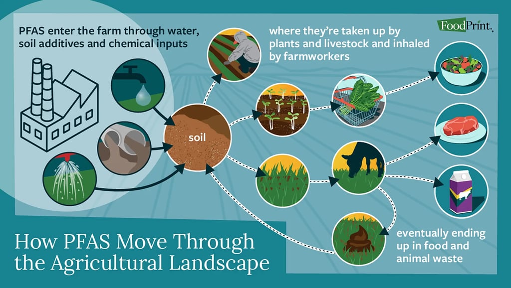 While PFAS have benefited industries, they come with a heavy environmental price. These chemicals do not break down easily in nature and can accumulate in soil and water systems, leading to long-term contamination. PFAS are particularly problematic in agriculture, where biosolid fertilizers derived from treated sewage can introduce these toxic substances into farmland. Once applied, PFAS leach into the soil, water, and eventually our food supply, creating serious health risks.